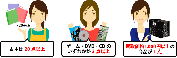 「古本は20点以上」「ゲーム・DVD・CDのいずれかが3点以上」「買取価格1,000円以上の商品が1点」以上の条件いずれかを満たしていれば、どのような組み合わせでもお申込みいただけます。
